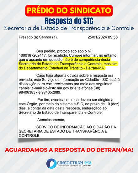 👉🏼 Sinsdetran já solicitou a cópia do processo administrativo que culminou na cessão, permissão ou instituto similar, do prédio do Sindicato dos Servidores do Departamento Estadual de Trânsito do Maranhão, conforme afirma o Diretor-Geral e o Diretor Administrativo do Detran, bem como a publicação do ato no Diário Oficial do Estado do Maranhão.