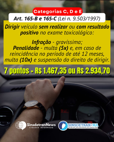 👉🏼 Art. 165-D (Lei n. 9.503/1997)Deixar de realizar o exame toxicológico previsto