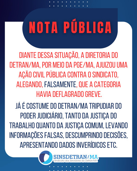 O Sindicato dos Servidores do Detran/MA repudia essa atitude covarde, nefasta e indigna da atual Diretoria da autarquia, por falsear a verdade, atentar contra a dignidade de seus servidores e expor a imagem do Poder Judiciário ao ridículo perante a população.