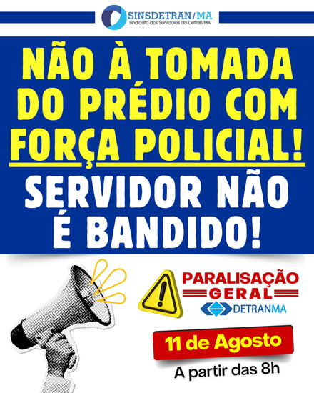 🚫 No dia 11 de Agosto, a partir das 08h, os servidores do Detran/MA farão uma paralisação geral em todo o estado do Maranhão.